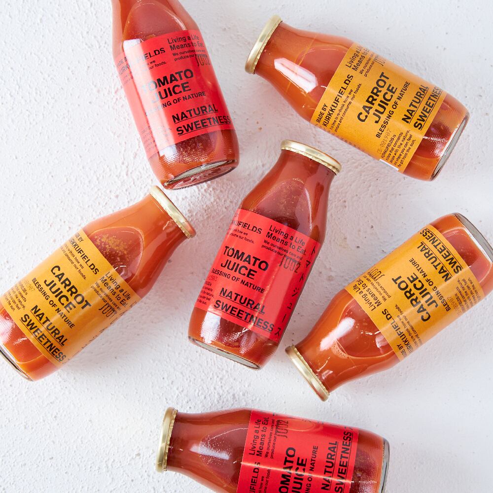 クルックフィールズのオーガニックファーム(※耕す)で生産された有機にんじん100%のジュースと有機ミニトマト100%のジュースをセットにしました。農場の人気のジュース2種類が楽しめて、ギフトにも喜ばれます。どちらのジュースも砂糖やフルーツを一切使わず、素材本来の味をお楽しみいただけます。にんじんジュースは、にんじんの甘みとすっきりした飲み口。有機にんじん3本分(※)の果汁が詰まっています。とまとジュースは優しい甘さで飲みやすい味わい。1瓶におよそ、大きめのフラガール14粒分(※)の濃厚な果汁が詰まっています。もちろん、添加物は一切入っていませんので、小さなお子様にも安心して飲んでいただけます。