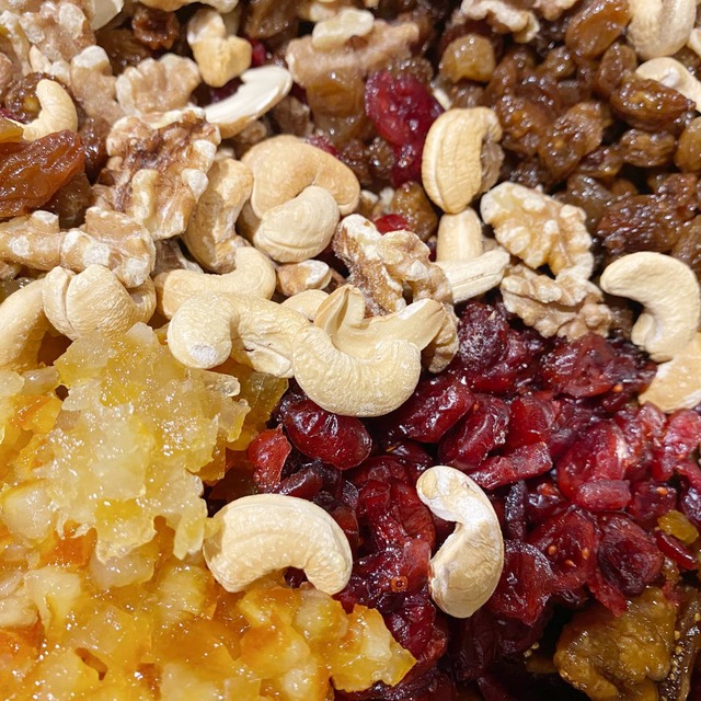 7種類の漬け込んだフルーツとナッツ、体を温めるカルダモンを中心としたスパイス、農場全粒粉とライ麦を使った力強いシュトレン。漬け込んだフルーツのみずみずしさが日に日に馴染み合う濃厚な旨味、深い余韻をお楽しみください。